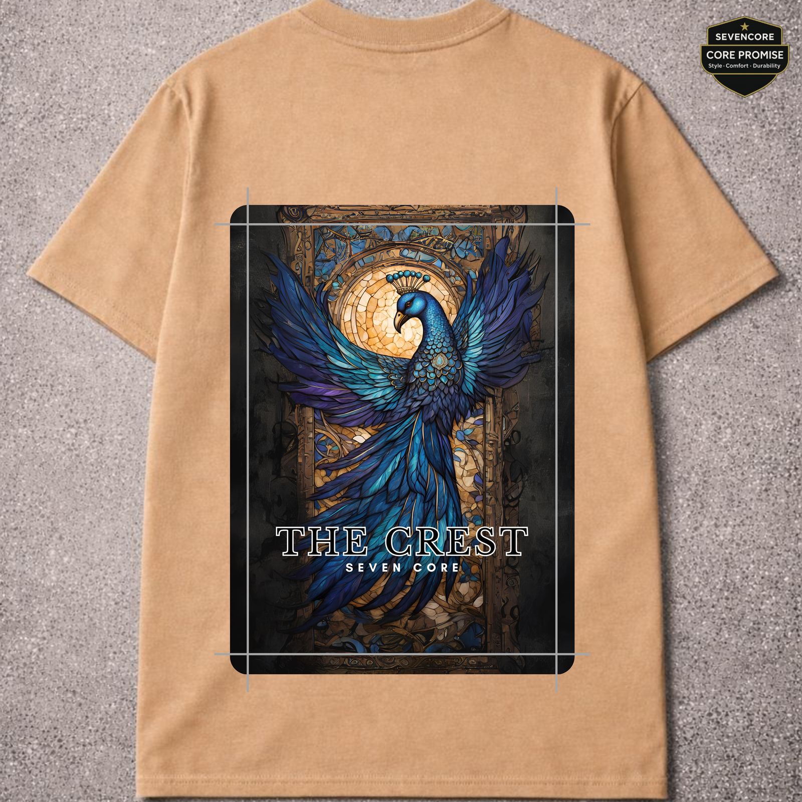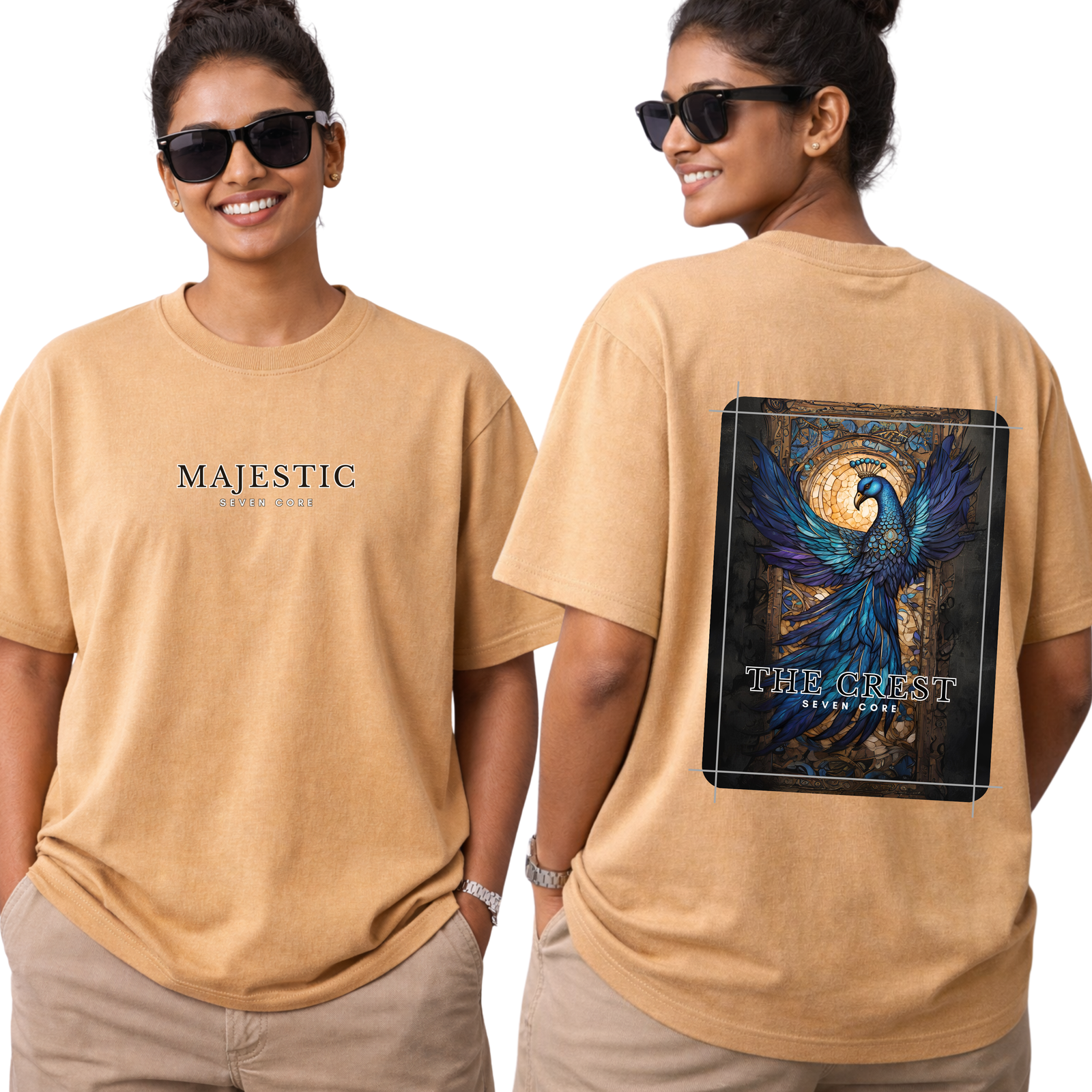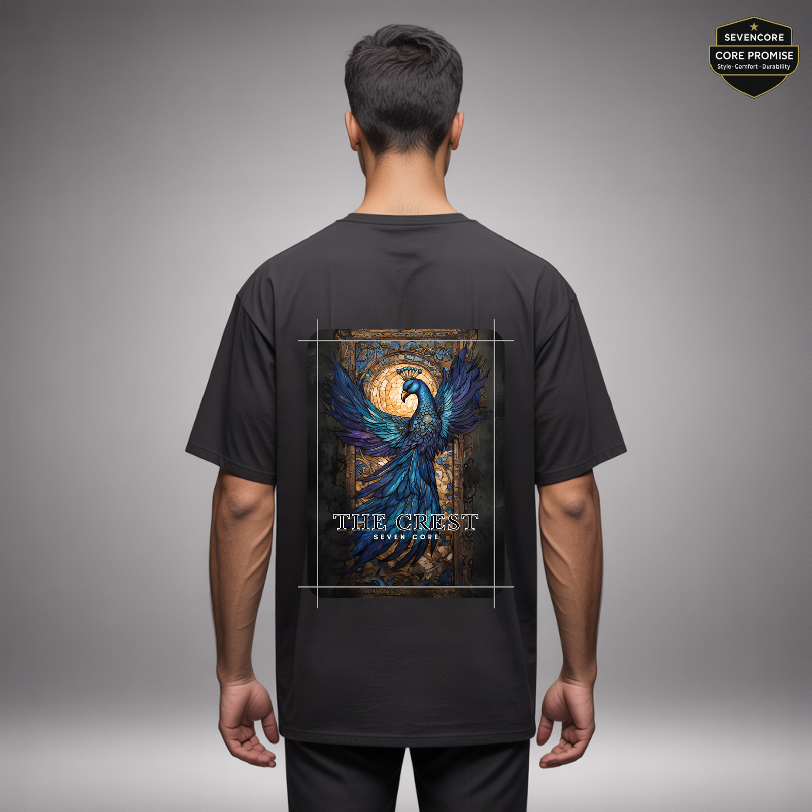 Back: Peacock-inspired sapphire-toned artwork symbolizing grace and quiet power